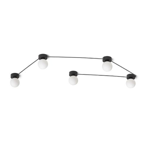 Stropní nebo nástěné svítidla se skleněnými stínidly na černě lakovaných základnách spojené do sady černými kabely v jedné linii. Svítidla lze rozmístit do seskupení dle vaší fantazie. Vhodné pro LED světelné zdroje s paticí G9.