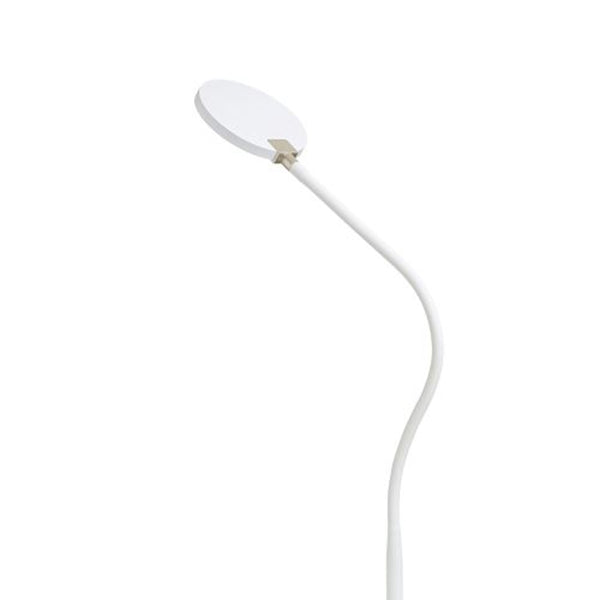 Stojanová stmívatelná LED lampa na ohebném krku s kruhovým reflektorem opatřeným mléčným difuzérem pro rozptýlené svícení. Ovládání je umístěné na stojanu.