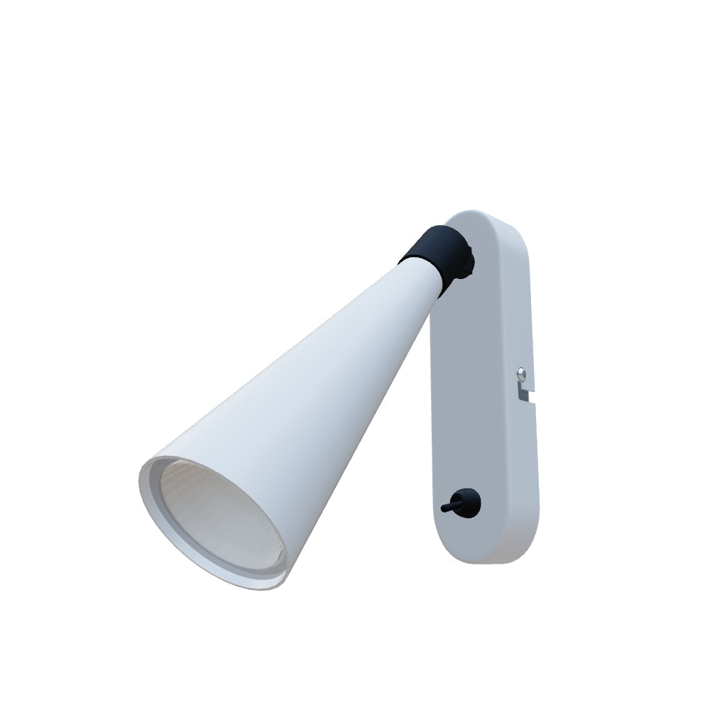 Nástěnné svítidlo s kónickým reflektorem pro LED žárovku s paticí GU10, páčkový vypínač je umístěný na základně.