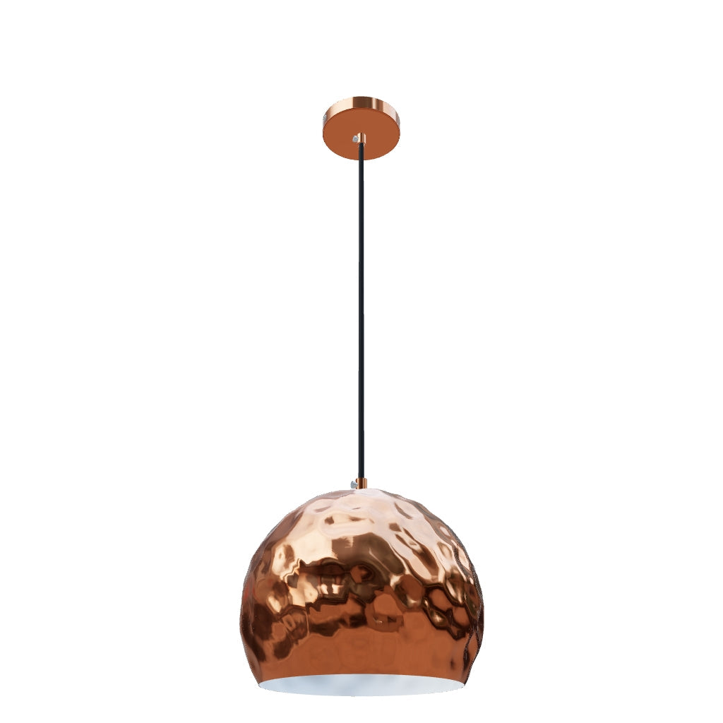 Závěsné svítidlo s promačkávaným kovovým stínidlem. Vnější strana stínidla je měděná, vnitřní strana je bíle lakovaná. Včetně černého PVC kabelu a měděné stropní krytky.