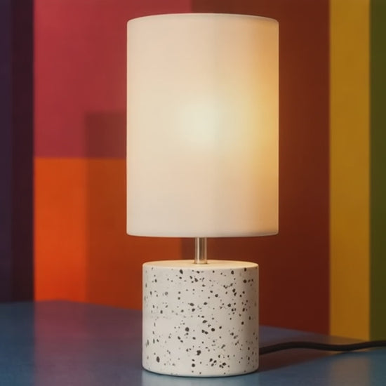 Minimalistická stolní lampička válcového tvaru s textilním stínidlem. Dekor každého svítidla je originální.