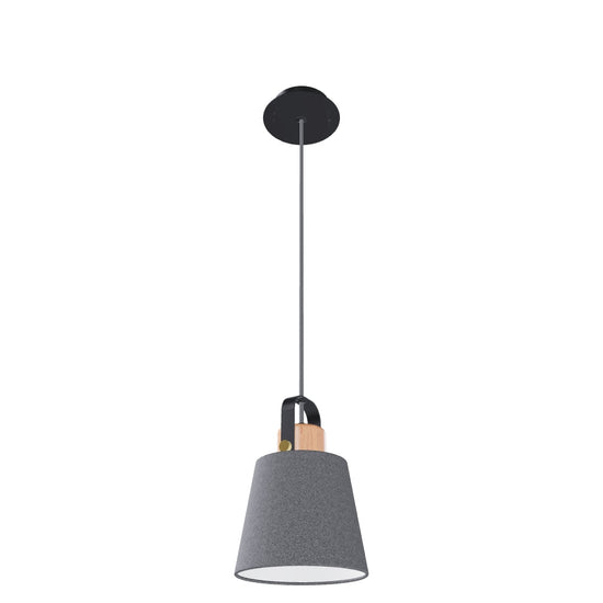 Závěsné textilní svítidlo s dřevěným doplňkem pro LED žárovku s paticí E27.