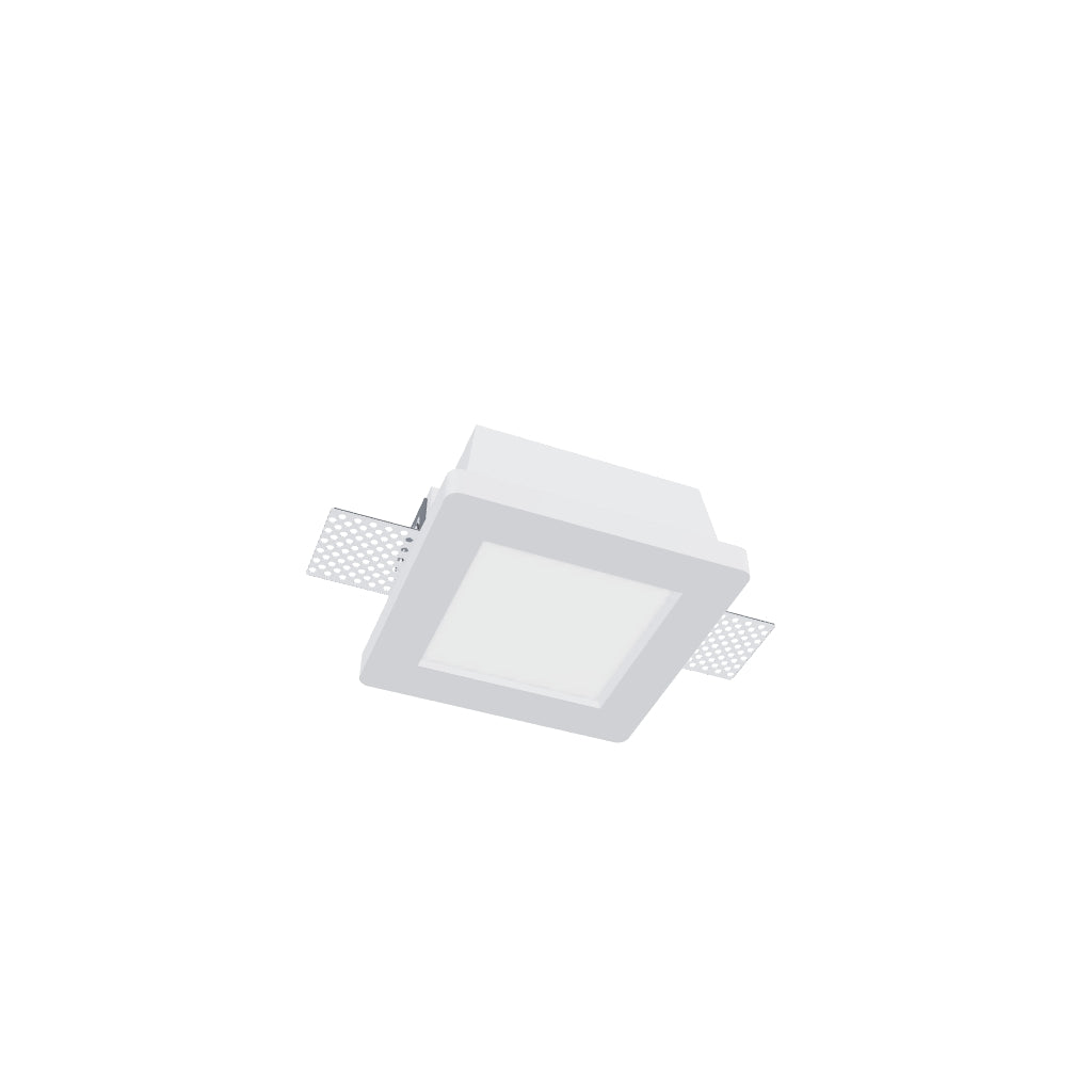 Zápustné sádrové čtvercové svítidlo se satinovaným krycím sklem pro světelné zdroje s paticí GU10. Montáž pouze do sádrokartonu.