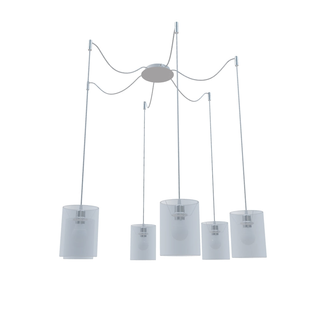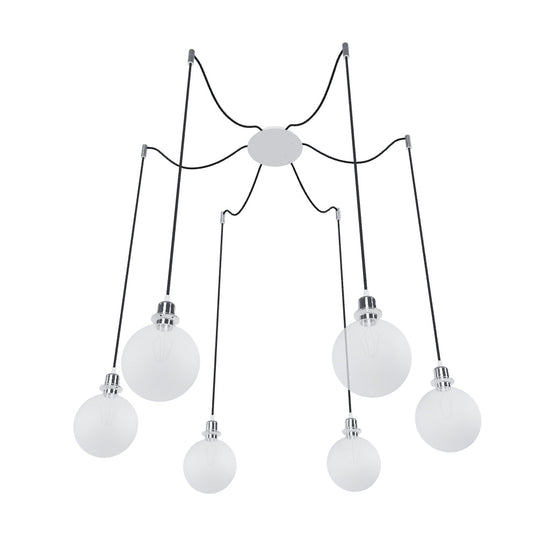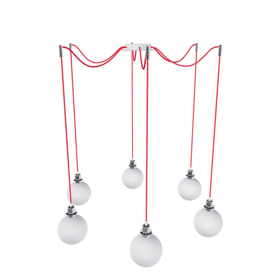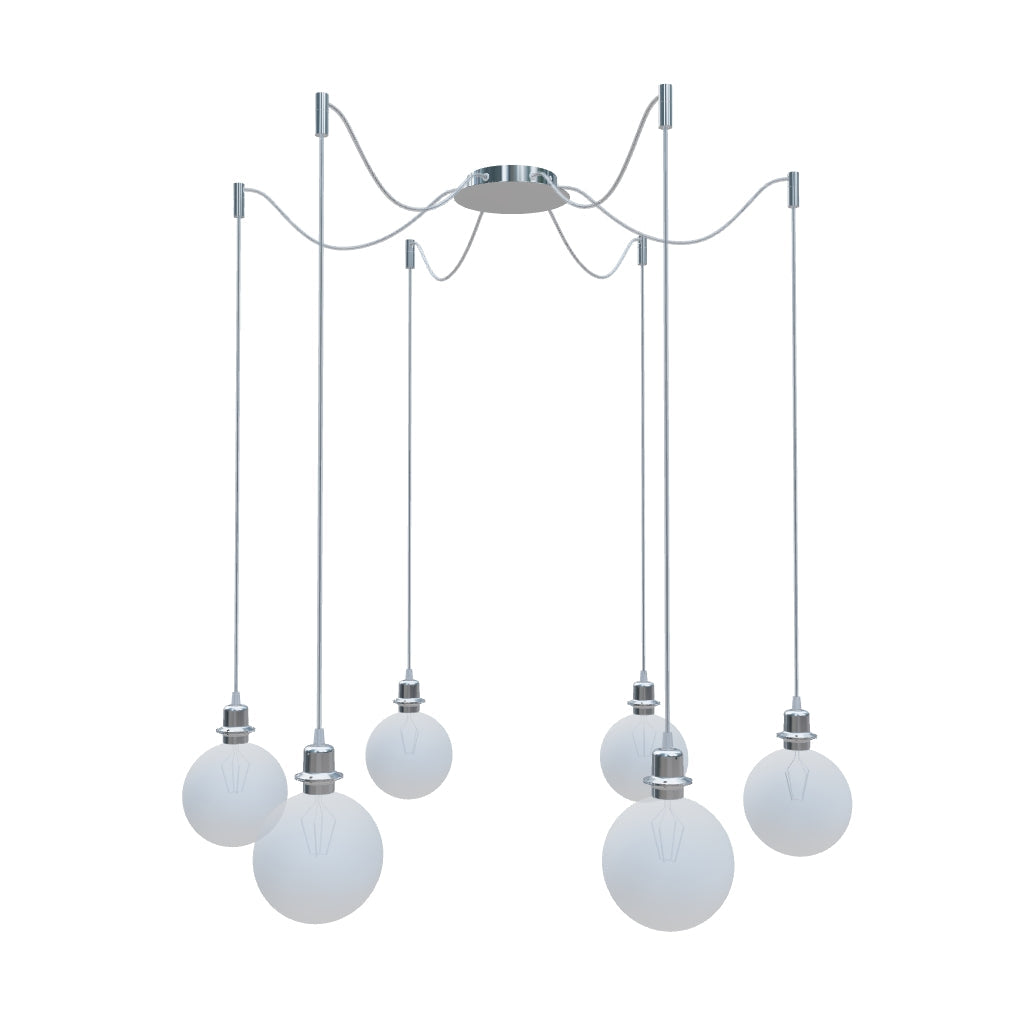 Závěsné svítidlo s centrální stropní základnou a šesti jednotlivými textilními závěsy s kovovou paticí E27, pro použití s dekorativními žárovkami nebo vhodnými textilními stínidly. Závěsy jsou opatřeny stropními chromovými úchyty, které lze umístit do individuálně zvolné vzdálenosti od základny. Celková délka kabelu 3 m.
