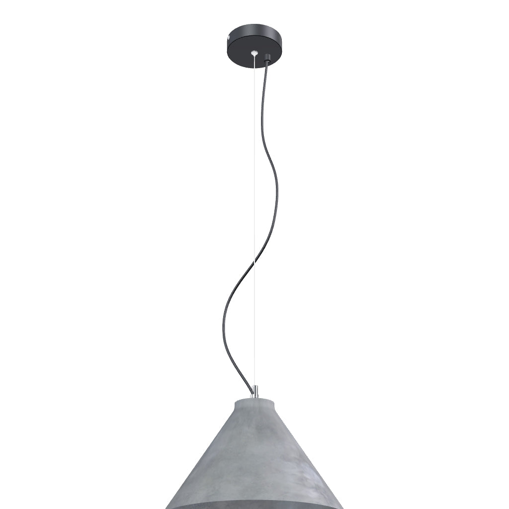 Masivní betonová závěsná lampa s uchycením na lanku a volně visícím kabelem pro žárovku E27.