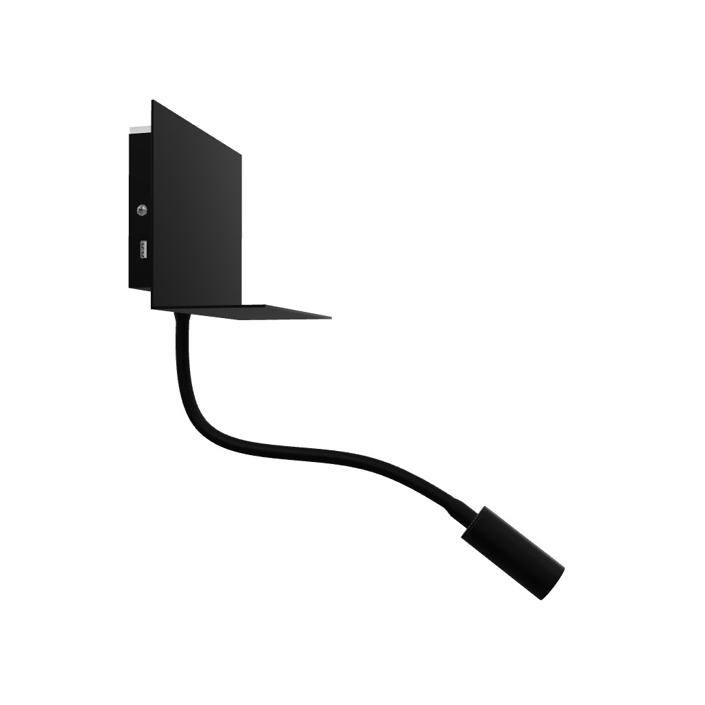 Nástěnné LED svítidlo s poličkou pro odkládání telefonu a integrovaným USB portem. LED bodovka na ohebném krku a nepřímé osvětlení jsou ovládány samostatně pomocí dvou vypínačů.